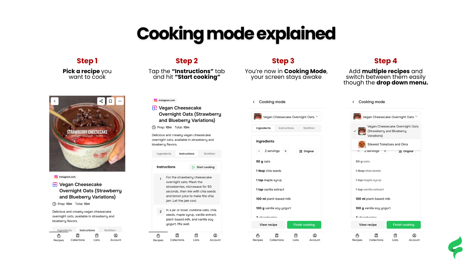 Step 4: Cook More Than One Recipe: Want to make a main and a side? No problem. Add multiple recipes to Cooking Mode. Use the dropdown menu at the top to switch between them.