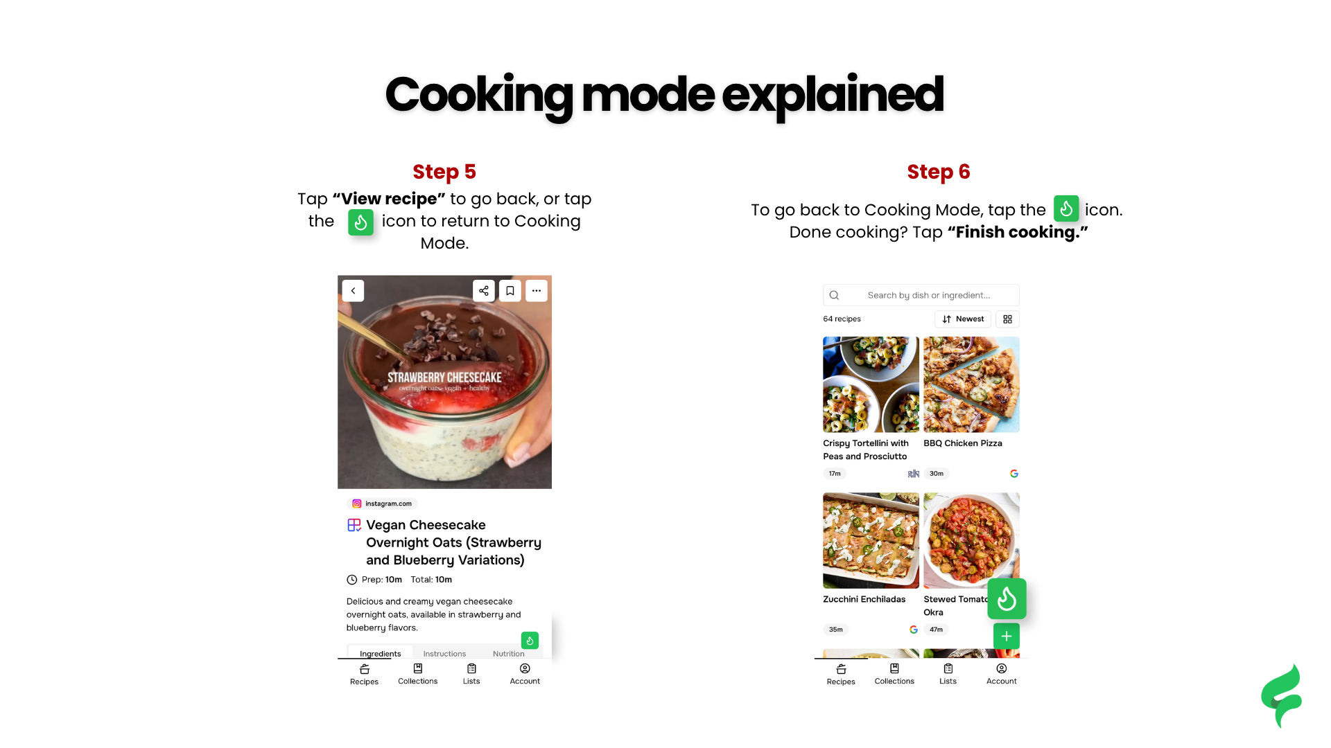 - Tap the 🔥 icon to reopen Cooking Mode at any time (visible across Recipes, Lists, and Collections)
