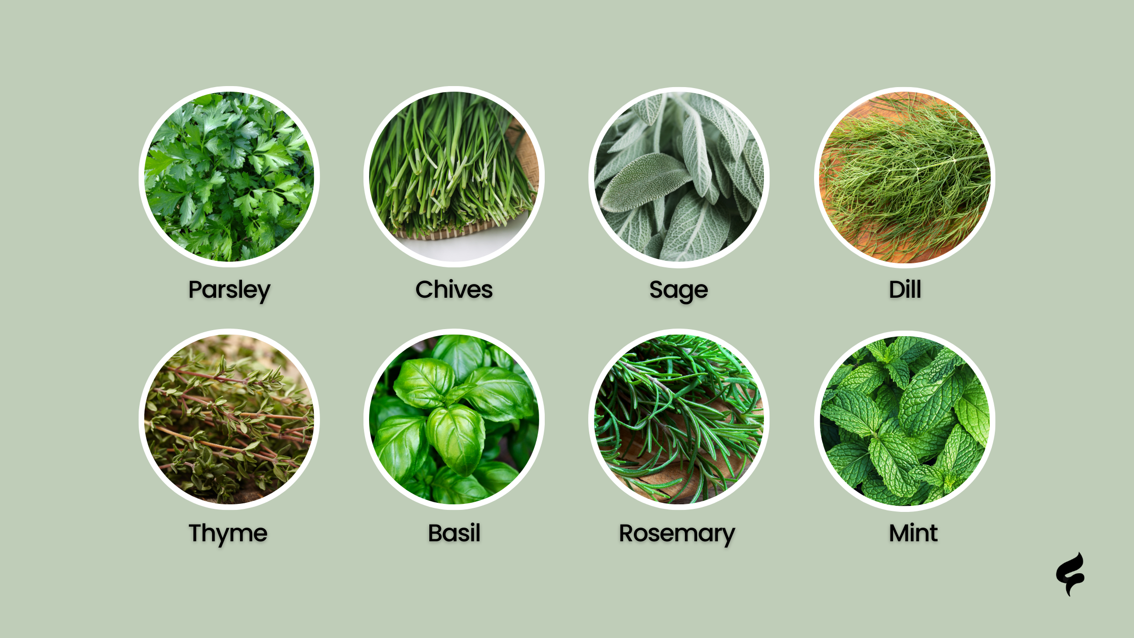 - Parsley: Bring established plants indoors in the fall, or buy new ones in spring (seeds take a long time to grow). Parsley is a versatile herb that can be used in a wide variety of dishes, from soups and salads to fish and chicken. Curly parsley is the most common variety, but there is also flat-leaf parsley, which has a stronger flavor.