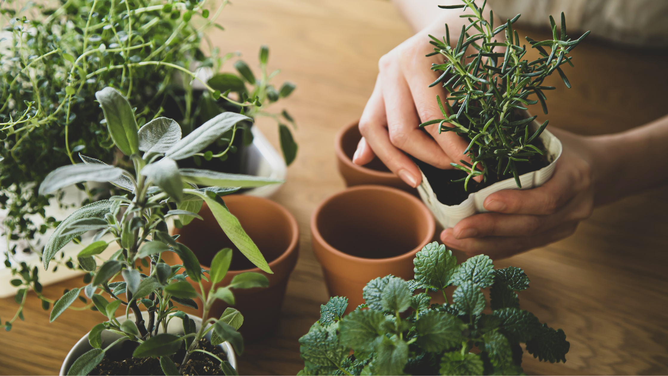 Find a sunny spot and plant your herbs in pots with potting mix according to the variety.