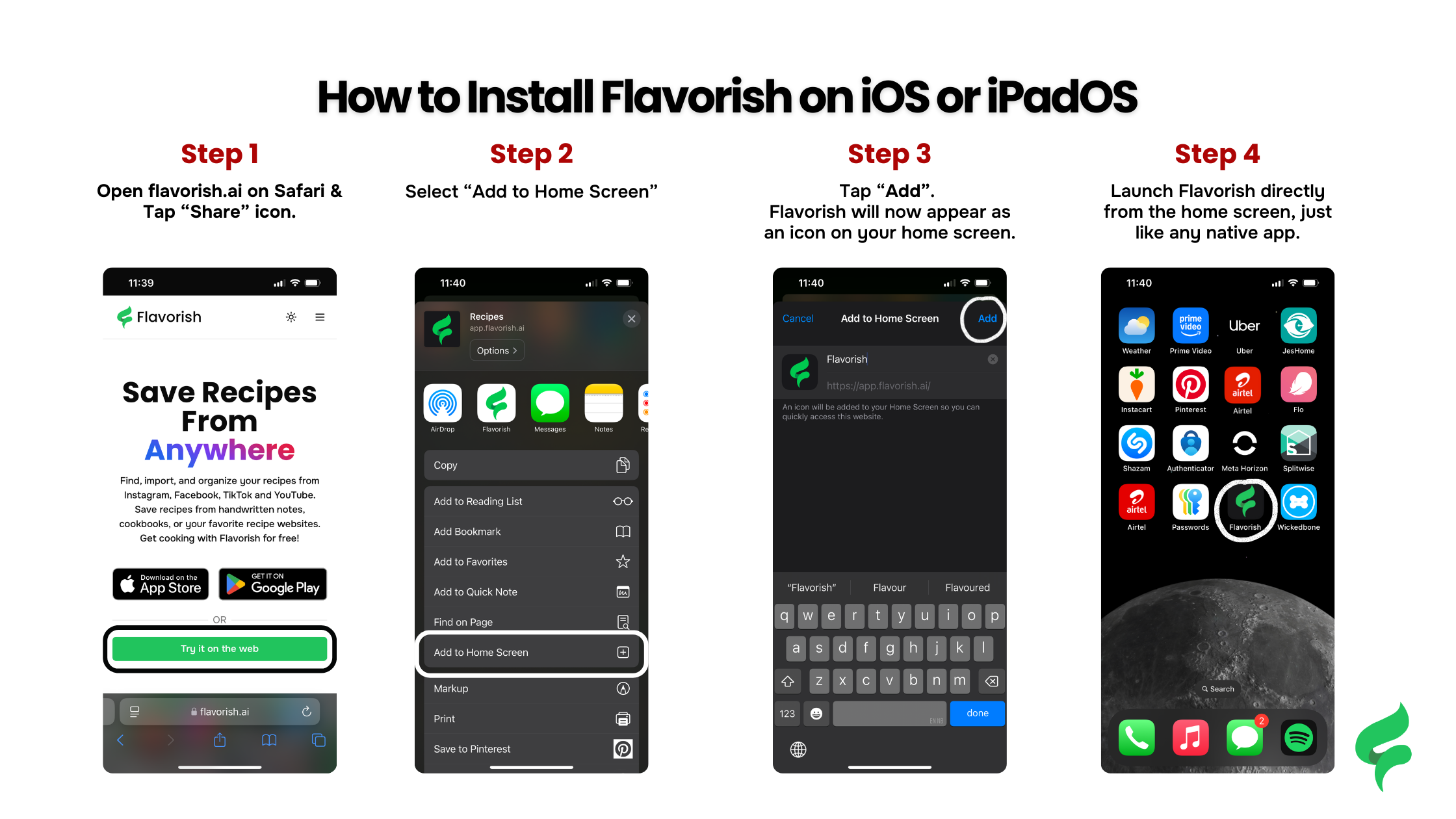Installing Flavorish on iOS or iPadOS doesn't involve an install prompt like other platforms. Instead, you'll need to manually add the PWA to your home screen: