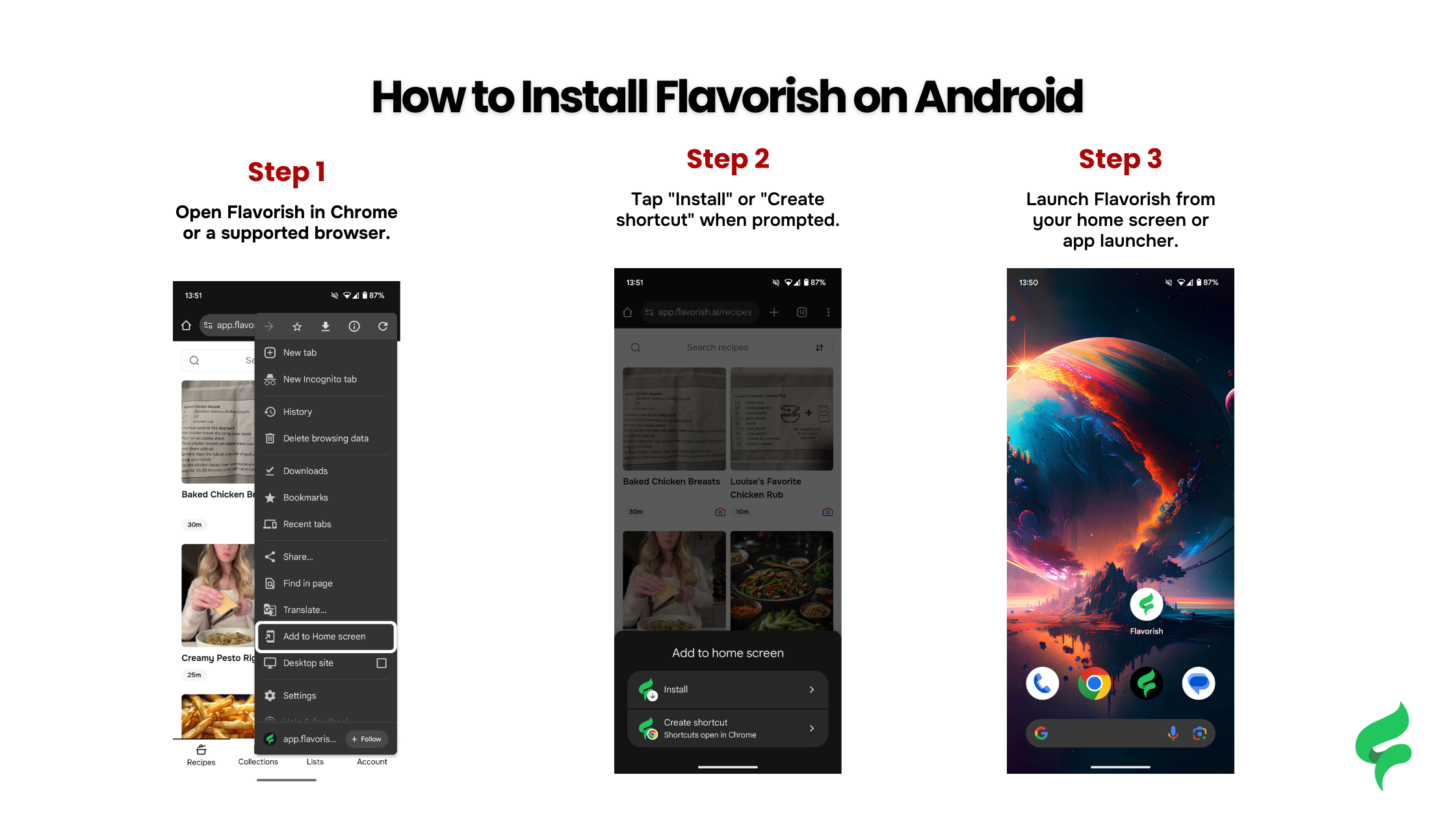 On Android, the process for installing the Flavorish PWA varies slightly depending on the device and browser, but here's a general guide: