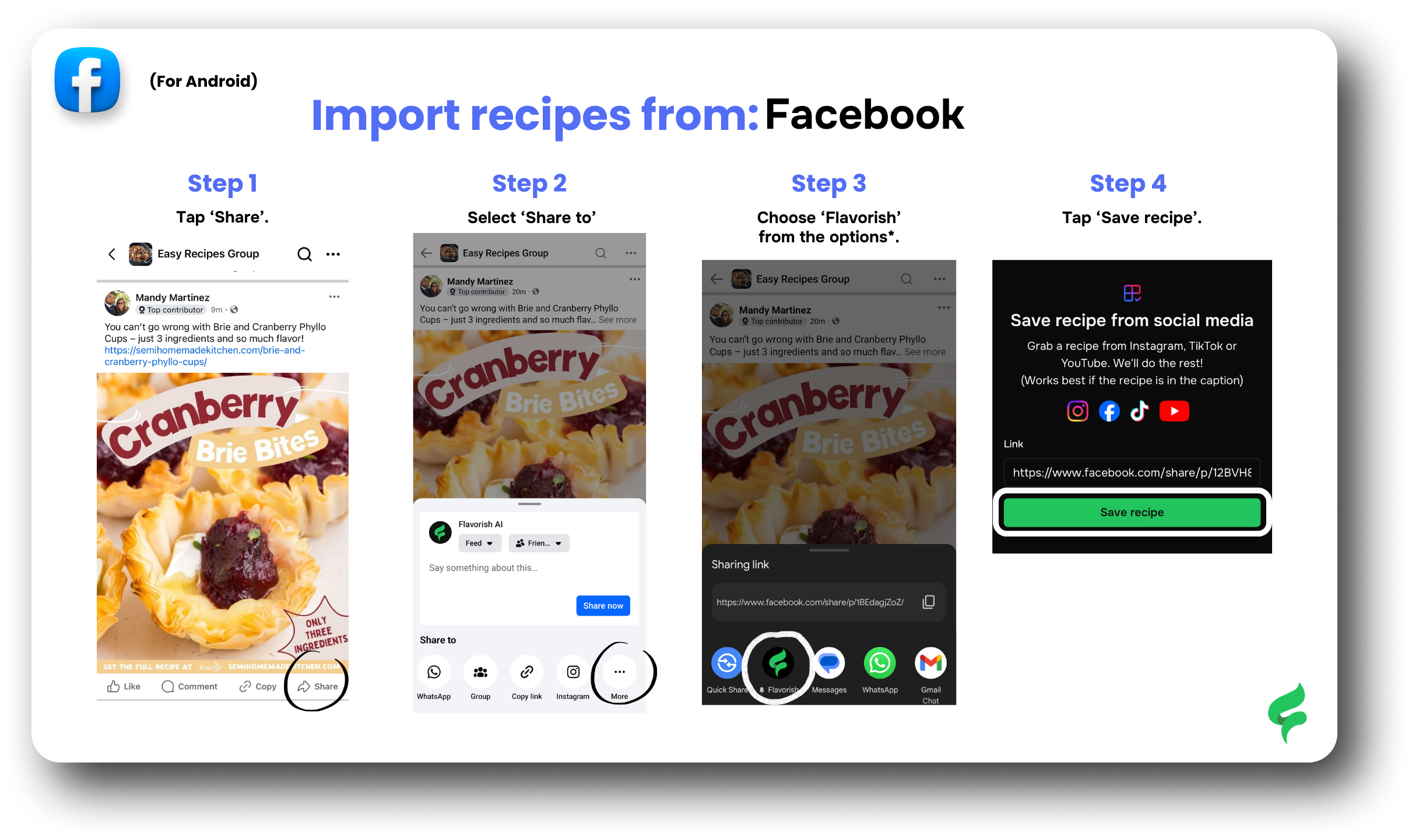 Facebook, with over 2.9 billion active monthly users, remains a powerful platform for sharing food content. From recipe posts in Facebook groups to videos from food bloggers, it’s a space where home cooks and professional chefs alike share their culinary creations. Save your favorite Facebook recipes directly into Flavorish and never lose track of a delicious find!