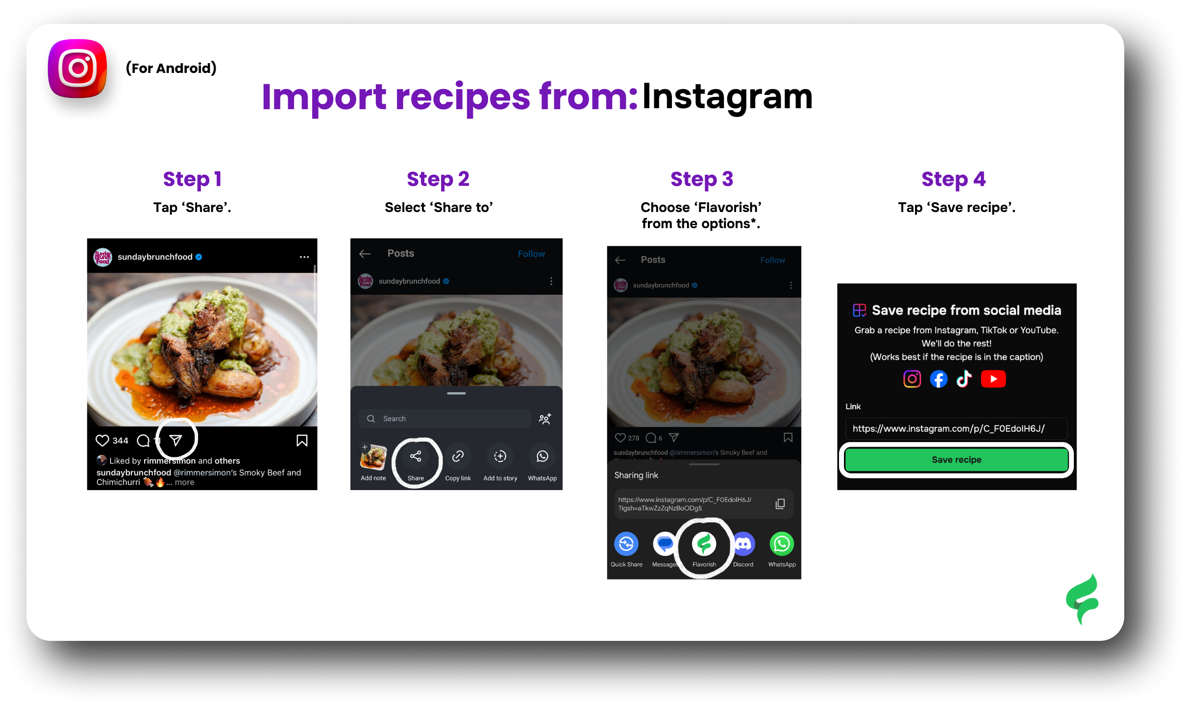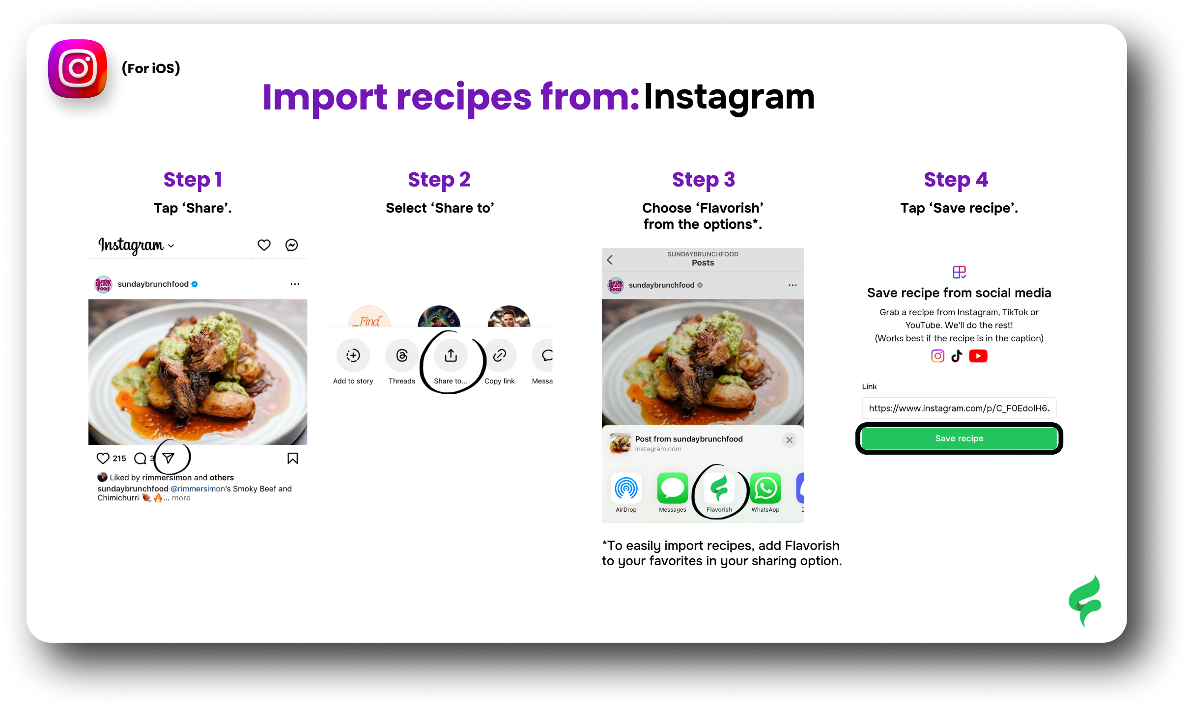 And that’s it! Sharing recipes to Flavorish is now just a tap away.With these easy steps, saving recipes from Instagram, Facebook, YouTube, and TikTok is effortless on both Android and iOS devices. Organize your favorite dishes and let Flavorish simplify your cooking journey.