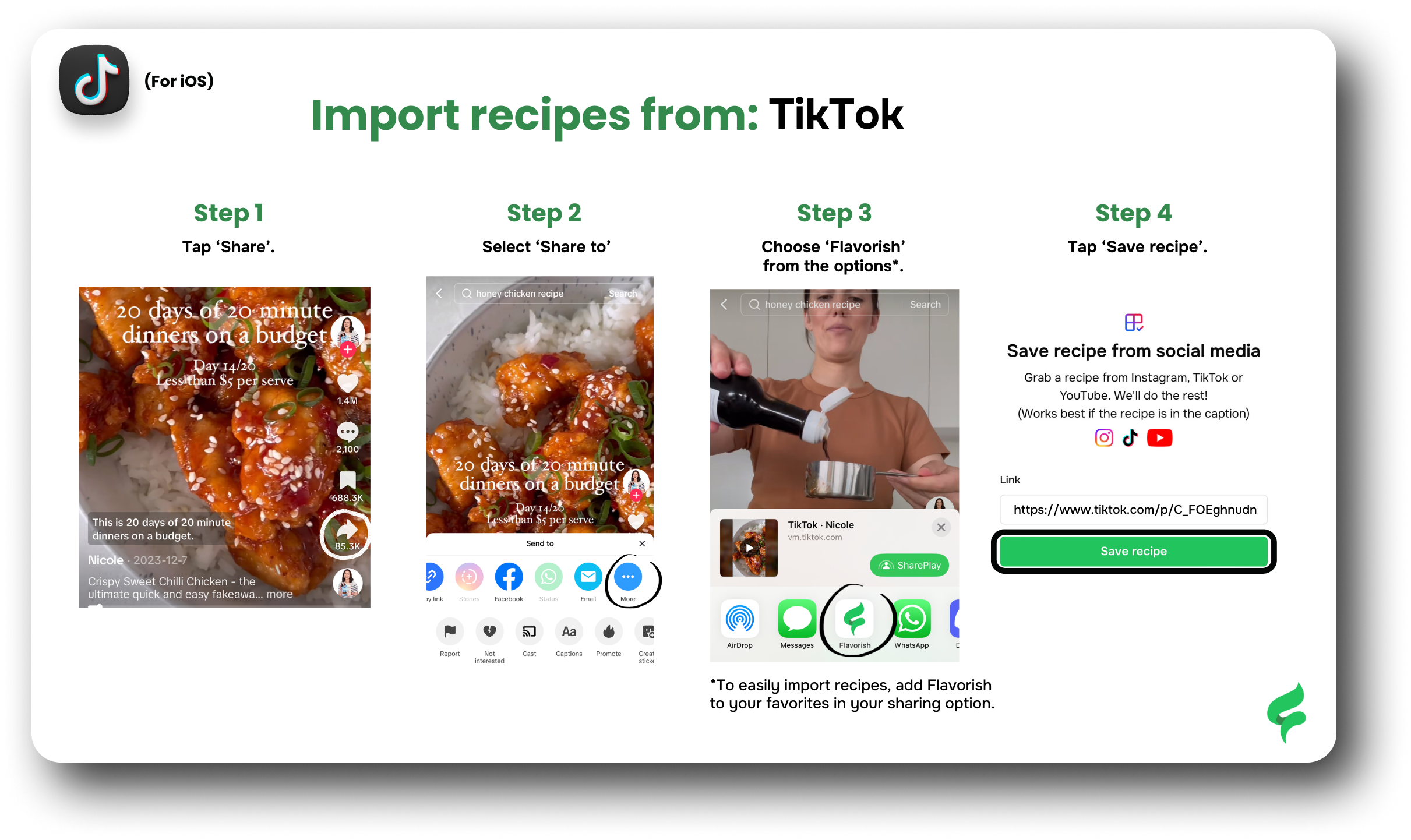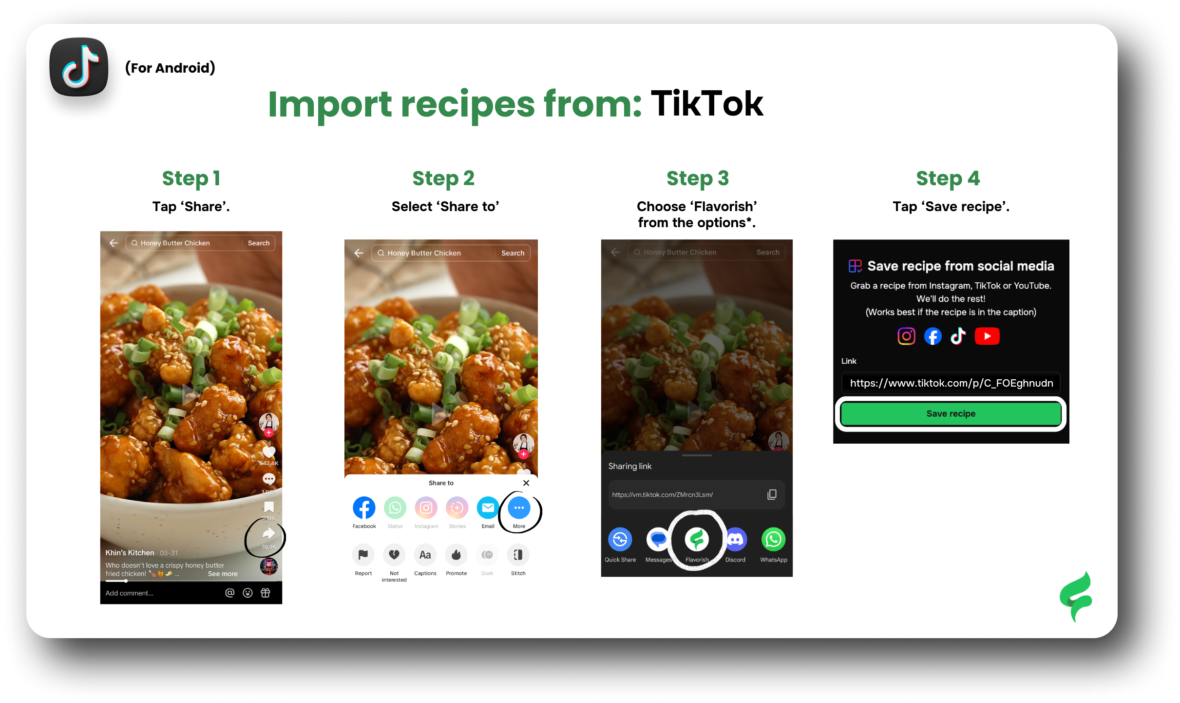 Whether you’re inspired by a TikTok video, an Instagram or Facebook reel, or a YouTube recipe, Flavorish makes it easy to save and organize your favorite dishes. This guide will walk you through how to import recipes from popular social media platforms, with specific instructions for both Android and iOS devices.
